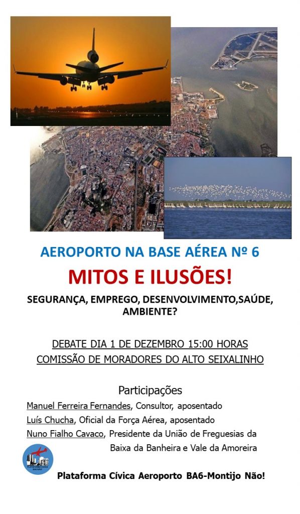 Por iniciativa da Plataforma Cívica e com a colaboração da Comissão de Moradores do Alto Seixalinho terá lugar, no próximo Sábado dia 1 de Dezembro pelas 15:00 horas, uma sessão de esclarecimento/debate sobre o eventual uso da Base Aérea do Montijo para aeroporto civil.